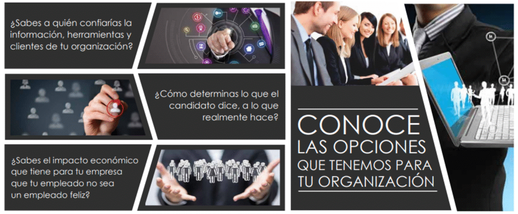 Acompañamos desde emprendimientos y pequeñas empresas en crecimiento hasta grandes organizaciones consolidadas, adaptando nuestros servicios a la realidad y necesidades de cada cliente; mediante servicios como atracción de talento, asesoría para registro y revisión de reglamento interior de trabajo, actas administrativas, descripciones de puesto,  evaluaciones psicométricas, validación de referencias, poligrafía, capacitación y proyectos especiales. Nuestro compromiso es impulsar entornos laborales confiables, eficientes y alineados a los valores de cada organización